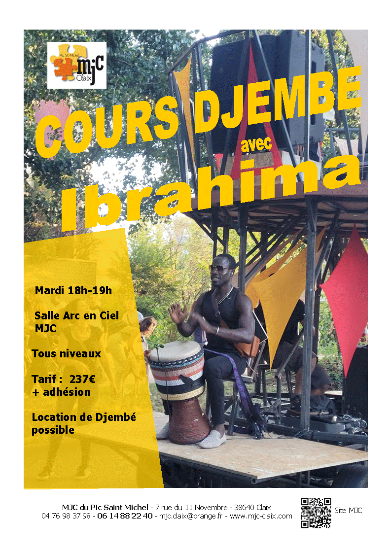 Djembé avec Ibrahima mardi 18h-19h à la MJC : tous niveaux.
