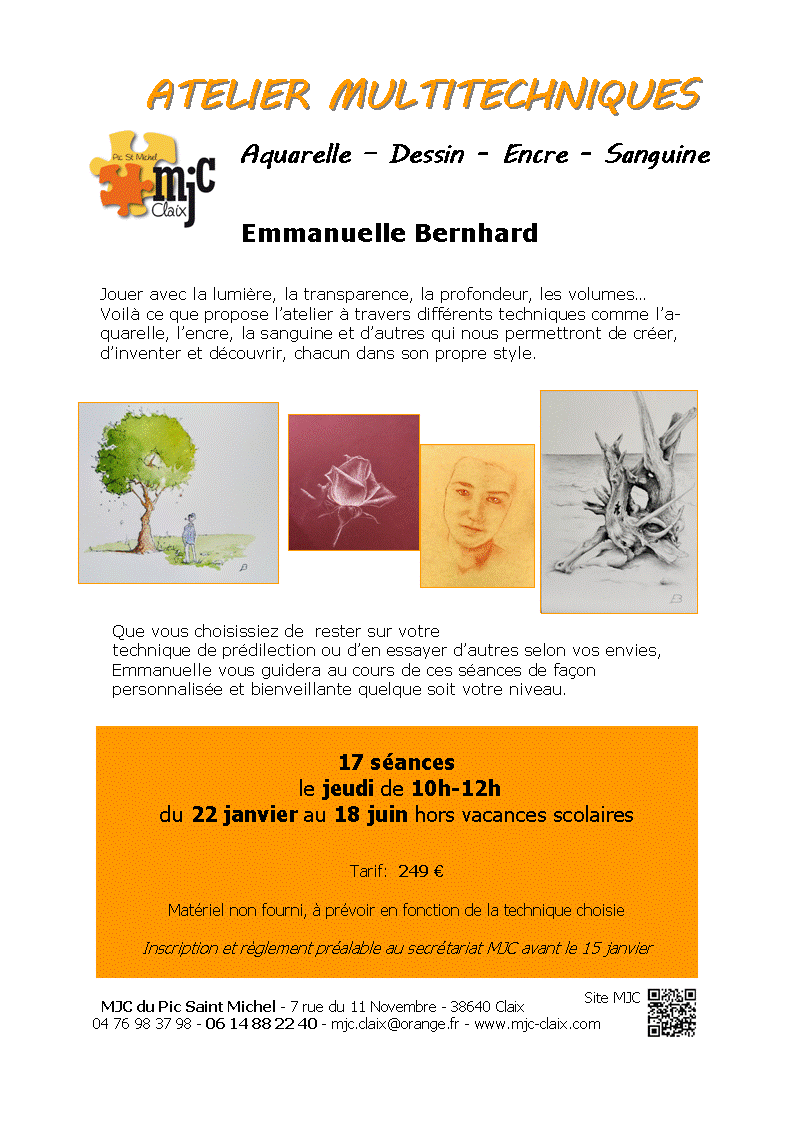- du 22 janvier au 18 juin: Atelier Multi techniques :Aquarelle-Dessin- Encre-Sanguine : jeudi 10h-12h animés par Emmanuelle Bernhard : 17 séances : 249€