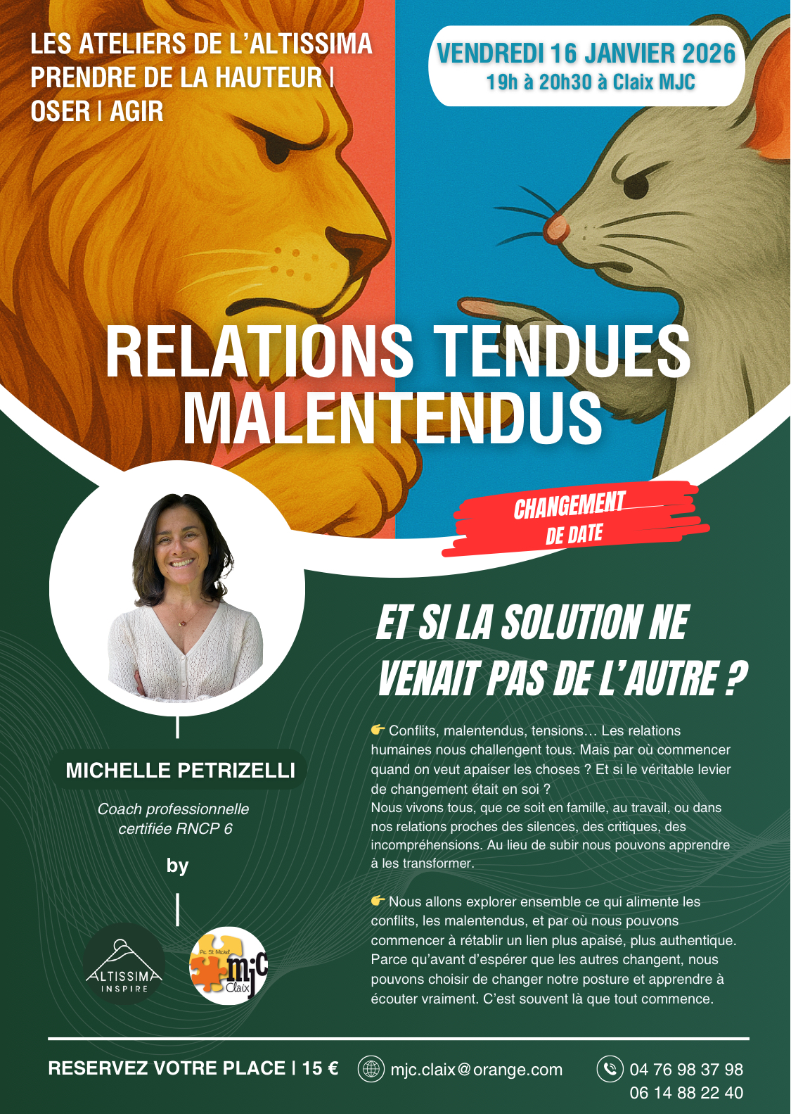 - Vendredi 16 : Atelier de l'Altissima " relations tendues, malentendus" 19h-20h30 animé par Michelle Petrizelli: 15€