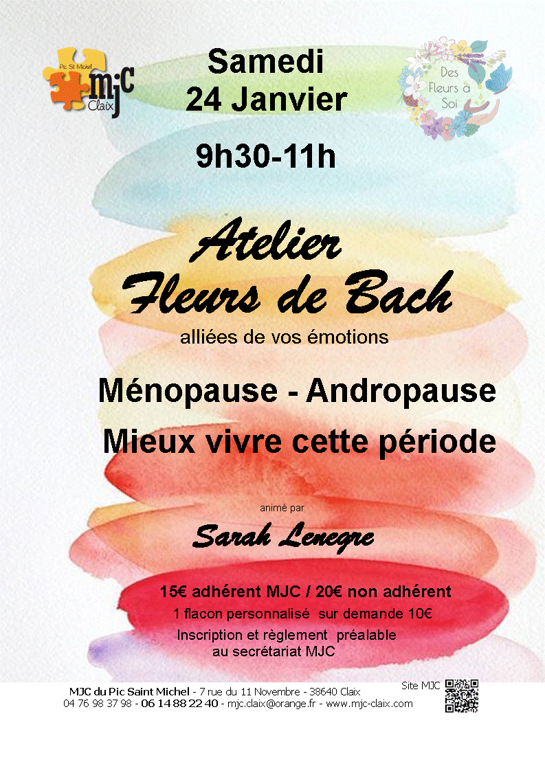 - Samedi 24 : Atelier Fleurs de Bach "Ménopause- Andropause: mieux la vivre" : 9h30-11h :animé par Sarah Lenegre 15€ - Flacon personnalisé sur demande : 10€