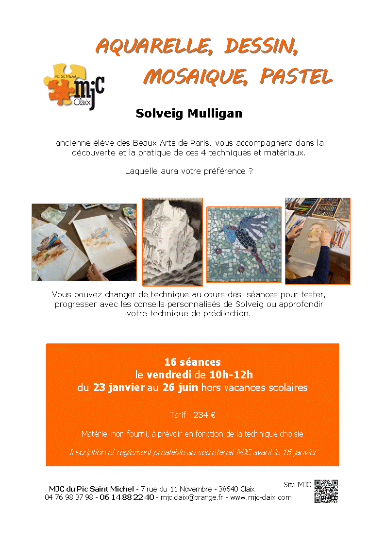 - du 23 janvier au 26 juin: Atelier Aquarelle-Dessin- Mosaïque-Pastel : technique au choix: vendredi 10h-12h animés par Solveig Mulligan. 16 séances :234€