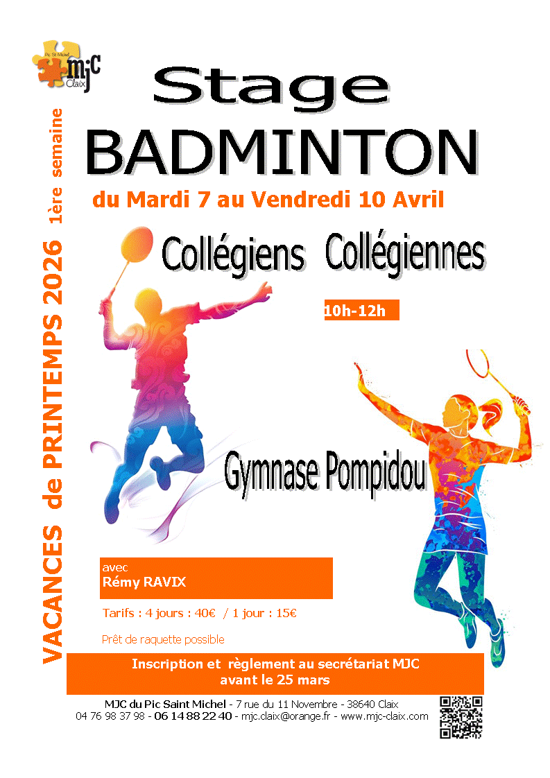 du Mardi 7 au Vendredi 10 avril : Stage Badminton 11-15 ans : 10h-12h Gymnase Pompidou : stage complet : 40€ / 1 jour : 15€