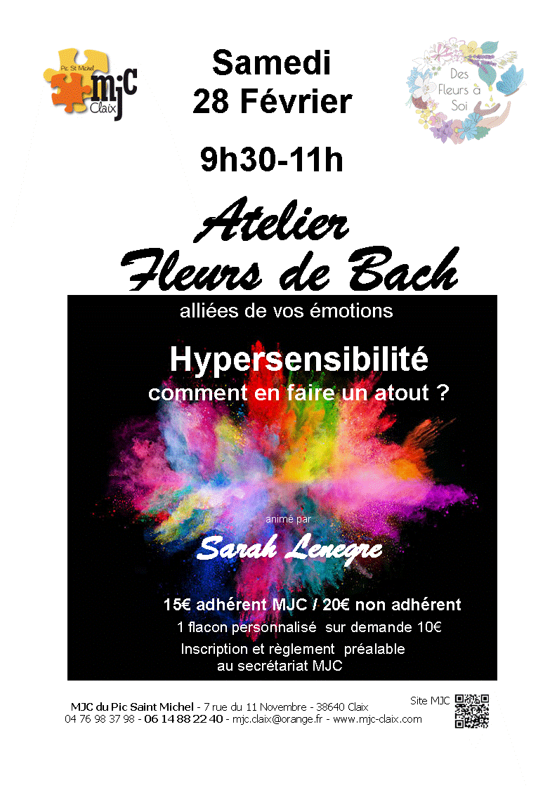 -9h30-11h : Fleurs de bach "Hypersensibilité, comment en faire un atout ? " adhérent : 15€ / non adhérent : 20€