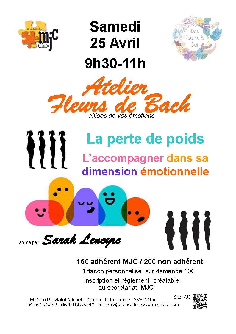 - 9h30-11h : Comment les Fleurs de Bach peuvent accompagner la perte de poids , dans sa dimension emotionnelle : adhérent MJC : 15€ non adhérent : 20€