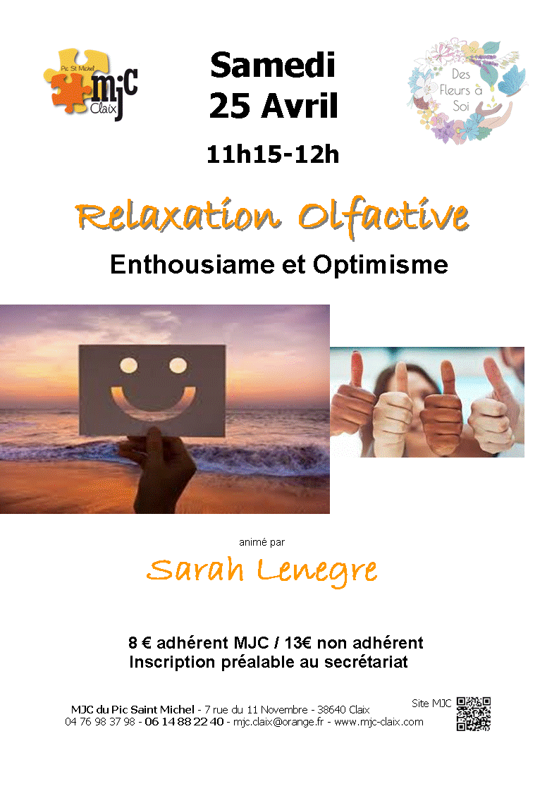-11h15-12h : retrouver développer l'enthousiasme et l'optimisme avec la relaxation olfactive : adhérent MJC : 8€ non adhérent : 13€