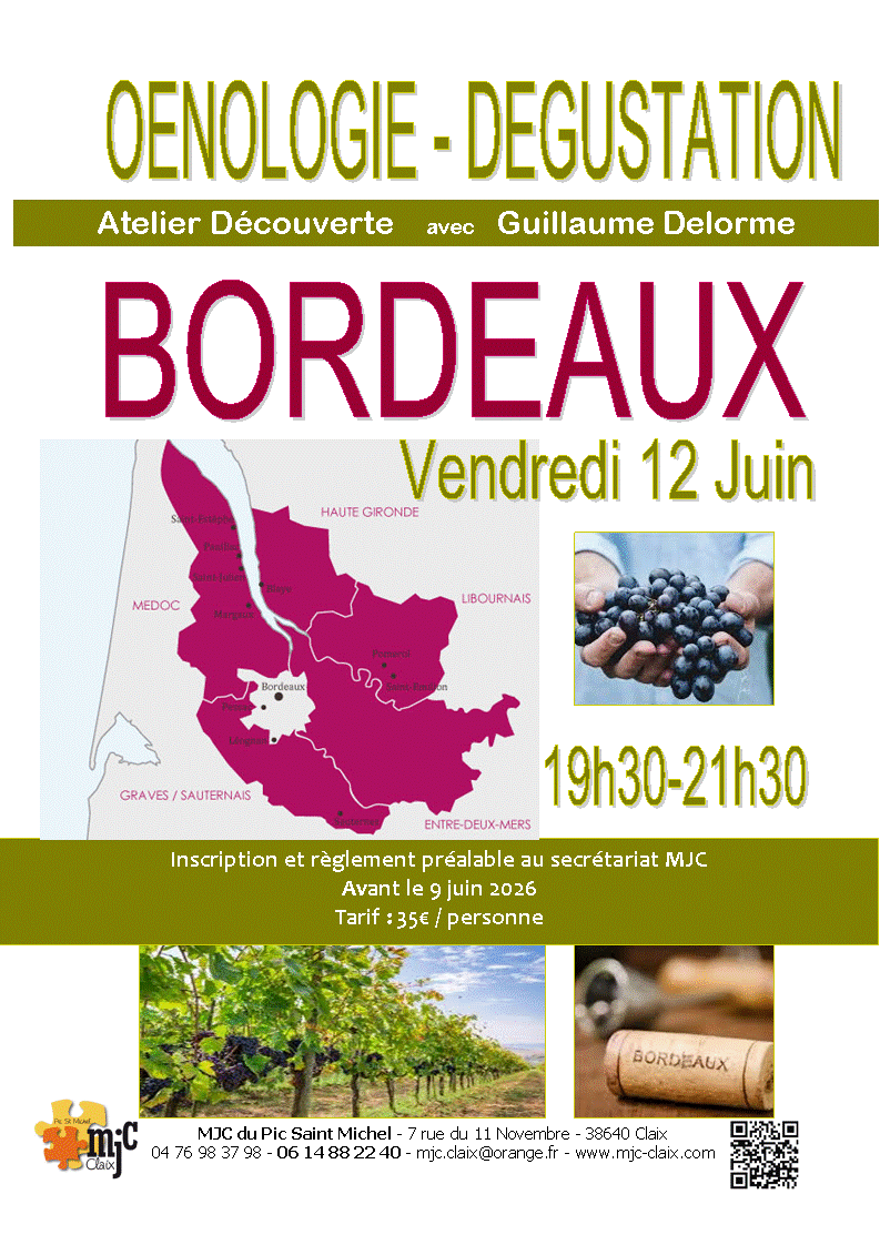Guillaume Delorme vous propose un atelier découverte axée sur les Bordeaux, vendredi 12 juin de 19h30 à 21h30.